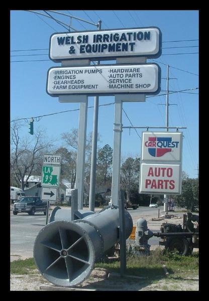 | What We Do Welsh Irrigation & Equipment LLC is a family owned and operated business formerly known as Welsh Equipment Co. Inc. We are located on the corner of Hwy. 90 and Hwy. 99 in Welsh, Louisiana. We specialize in installing irrigation pump systems; we also have a large selection of auto parts, home and garden hardware, farming hardware, clothes, shotgun shells, and much, much more. Come by and see us! |